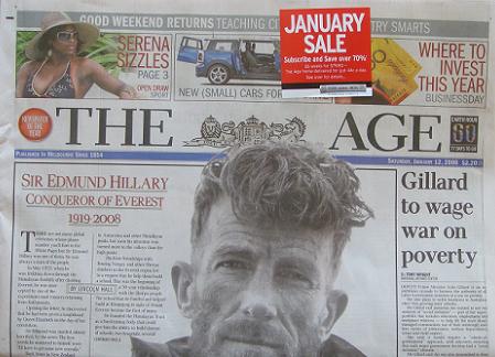 Congratulations to the folks at The Age newspaper for pulling focus from the front page story about the passing of Sir Edmund Hillary with another garish and hated by customers stuck on ad – this time for their own newspaper. See for yourself how awful this looks…