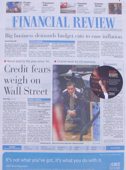 Another win for Advertising over news content at the Australian Financial Review today with a round Post-It type ad stuck on the front page of the newspaper. From what I hear from others, Fairfax leads the world in desecrating the their newspaper mastheads and pages with these stuck on ads.
