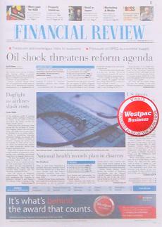 The front page to today’s Australian Financial Review newspaper has been trashed by an ad for Westpac bank stuck over a news story. The post-it note type ad is a great ‘get’ for Westpac as it pulls visual focus, like any good ad should. Everyone looking at the the AFR in a newsagency today will see the Westpac ad first.