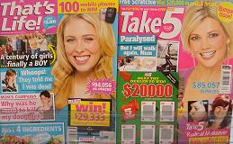 Take 5 and That’s Life look very similar this month. One customer I talked to yesterday was confused. Why do they make them look the same she said. I agree. The change in the That’s Life masthead to pink is odd. The customer I spoke with thought it was Take 5…