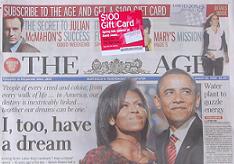 The Age today has a house ad for home delivery stuck on top of a photo of AFL footballer Buddy Franklin. Inside is a story about Buddy’s big game today where he is expected to crack 100 goals in a season. I would subscribe to a newspaper for content and not a free gift.