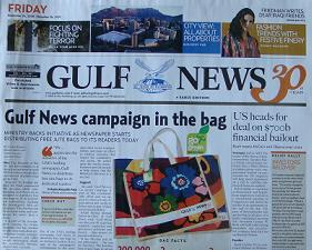 The front page of Gulf News in Dubai on Friday lead with a story about their plan to give two jute bags free to all subscribers in recognition of its 30 year anniversary. The Ministry for Water and Environment endorsed the campaign as did the Editor-in-Chief. The above the fold front page coverage for the carry-bag giveaway is a level of self promotion we thankfully don;t see too much of in Australian dailies.