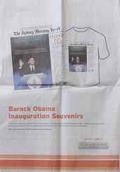 The Sydney Morning Herald today (curiously in the business section) is promoting the availability of a t-shirt with a reproduction of the front page of the SMH issue covering the Obama inauguration.