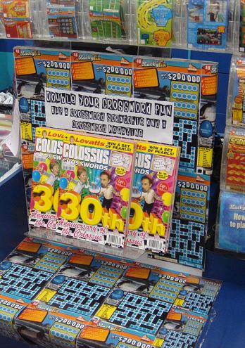 We are promoting instant scratch tickets and crossword magazines at the counter this week in our Double Your Crossword Fun promotion. We have used an oversized copy of the $5.00 Intralot crossword scratch ticket as the backdrop for latest issue of Lovatt’s Colossus crossword magazine.