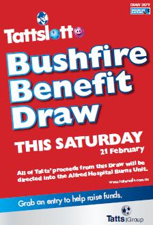 The initiative from Tattersalls to donate their proceeds from this Saturday’s Tattslotto draw to the Alfred Hospital Burns Unit in support of the Bushfire Appeal is excellent and deserves kudos. I especially like that they have been transparent in their press announcement about what they expect to make – $3.5 million.