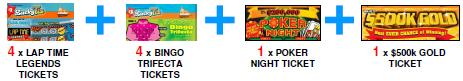 Intralot has released a consumer competition which can only be described as ridiculous. To enter you need to have four losing $2 lap time scratch tickets, four losing $3 bingo trifecta scratch tickets, one losing $5 poker night scratch ticket and one losing $10 $500K Gold ticket. Up for grabs is one of six $5,000 holidays in New Zealand. Entry is expensive and convoluted – you need to post the tickets to Intralot. The games themselves are old, I suspect this is why they are running the competition.