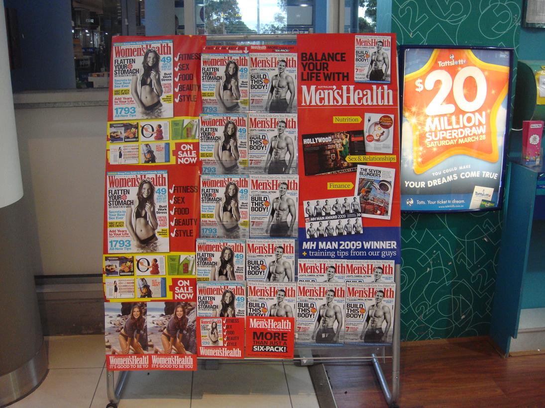 We are promoting Women’s Health and Men’s Health out the front of our Forest Hill store this week. We never place posters for a magazine without an opportunity to buy. Click on the thumbnail for a larger version.