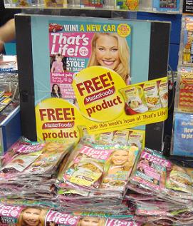 We bumped the Family Circle promotion from our premiun front counter location to make way for That’s Life and the free MasterFoods pack which comes with each issue. This was an opportunity too good to pass up. The free gift is excellent value. We expect it to work very well with our demographic. We will re-position Family Circle next week or when, hopefully, That’s Life sells out. Given the shape of the MasterFoods gift it was a challenge to display the product in our usual way so we have adopted the simple stack approach.