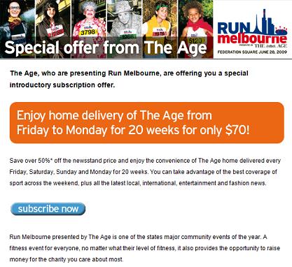 The Age has pitched an exclusive subscription offer to participants in Run Melbourne, a half marathon (and other distances) event on June 28. They are offering 20 weeks of Monday to Friday home delivery of The Age for $70, less than half price. I don’t mind this offer since they are not using retail sales to promote it.