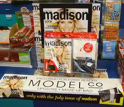 The free lipgloss and make-up bag and Madison magazine make a nice pacakge for our main counter magazine offer this week.I like the care taken with the packaging – showing off the gifts and their value without detracting from the cover of Madison itself. This is key to driving an impulse purchase at the counter.