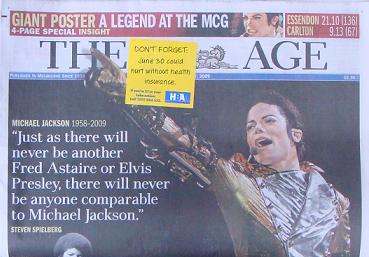 The ad for HBA stuck over the masthead of The Age newspaper this morning is an interesting placement given the Michael Jackson coverage. The ad covers not only the crest of the newspaper but also the date. This is poor treatment of an iconic Victorian brand.