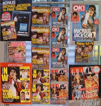 Magazines featuring Michael Jackson tributes have been given prime position this week. The photo shows the feature display which lines the approach to our main lottery counter. We have allocated space based on the extent of Michael Jackson coverage. We selected the supporting posters based on those which featured the Michael Jackson coverage in the magazine.