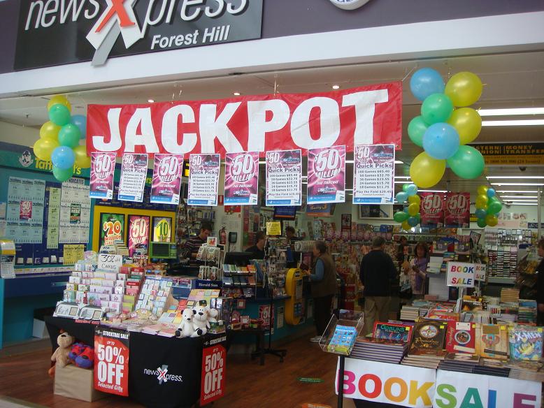 We are actively promoting the Powerball $50 million jackpot from the front of our newsagency through the shop. We have resurrected an old (years old) vinyl sign for above the entrance as it presents a visual point of difference to the usual corporate image promotion. We tested this with during the OzLotto jackpot and it worked well – we noticed customers noticing the sign. Click on the image for a larger version of the photo. we still have the corporate image display behind the counter and in our Tattersalls dedicated area.