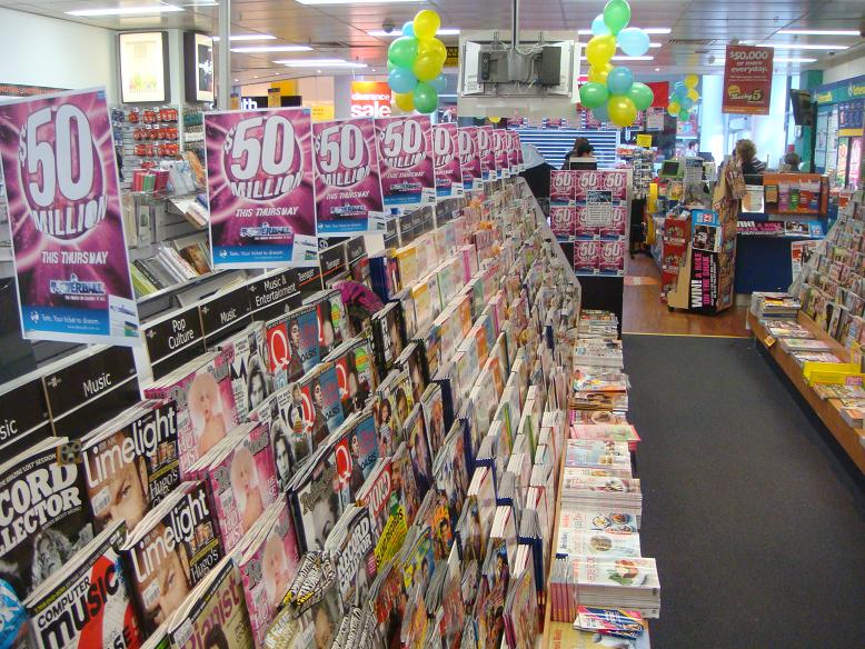 Deep inside our newsagency, above our magazines aisles, we have A3 posters promoting the Powerball $50 million jackpot. Click on the image to see just one of the aisles. Both look this good – better in real life than the photo. Our thought here is that we want to get customers as they either head to the counter to make a purchase or leave after browsing. While Tattersalls does not recognise this extra effort, we know from our own tracking that it is good for our business. If we can add a lottery ticket to a magazine purchase, it makes the magazine purchase that much more valuable.