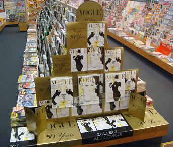 Like many newsagents, we have given prime position to the celebration of Vogue magazine’s 50 years. The collateral is excellent, true Vogue style. The multiple covers are stunning.
