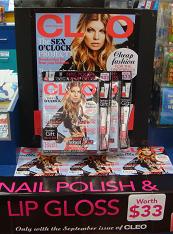 We are promoting Cleo magazine at the counter this week. The free nail polish and lip gloss make this an excellent impulse purchase opportunity. I like the way the gifts are displayed – in the sleeve next to the magazine.