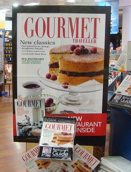 We are promoting Gourmet Traveller (out today) and their 2010 Restuarant Guide. The display is situated in a premium location, facing shoppers leaving our two main magazines aisles. This is the back of the ACP basket Builder stand – space which many do not use.