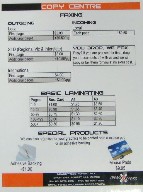Further to my post earlier this week about charges for copying in newsagencies, click on the photo to see our fax price list. We settled on this pricing following discussion of the managers of my newsagencies and considering what I had see others charge. Customers don’t complain about our charges for faxing or copying. They are happy to have a locally available service accessible seven days a week for long hours each day. We took $2,600 in fax revenue last financial year.