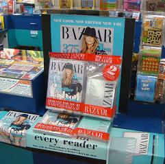 We are promoting Harpers Bazaar magazine at our counter this week thanks to the free notebook and pencil gift provided with every copy. The offer looks stunning when opened out flat – as on the display. We will leave this in place for three days and see how it performs. We also have a double facing display in the usual location for Bazaar in our fashion area.