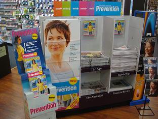 The second issue of Prevention from Pacific Magazines went on sale today. We are repeating the promotion strategies which worked for us last month including this display with our main newspaper stand. We sold three times the initial allocation of the launch issue.