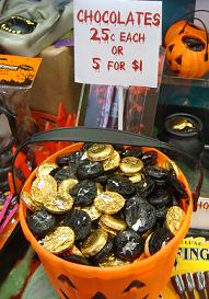 In addition to selling Halloween costumes and party items, we put out our range of Halloween candy last weekend. The chocolate is popular as singles and also when sold in small pumpkin buckets holding ten chocolates.