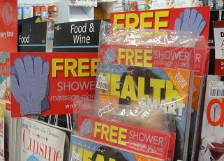 Health Smart from Reader’s Digest is pinching space from other magazine titles with their flag-like promotion for the free shower gloves which come with the current issue. While this works for their title, it blocks the next title along.