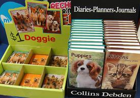 A cute dog or cat photo will sell just about anything, especially at the counter. Each time we bring in the small pads on the left side of the photo they quickly sell out. This time around we have placed the pocket diaries next to the pads as they appeal to the same customer. Our goal here is to sell two items instead of one. Both are price for a quick sale.