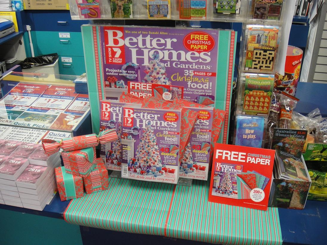 We are proud of the deatil in our Better Homes and Gardens main counter display at newsXpress Forest Hill. We are featuring the free wrapping paper which comes with this issue. The display was helped by using some of the spare wrapping paper to show it in use. Click on the photo to see a larger version. We plan at this stage to leave this display up until Wednesday of next week.