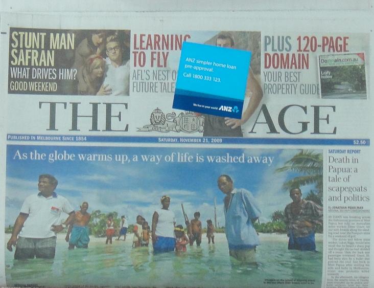 The Age covers editorial on page 1 ·November 21, 2009 ·Mark Fletcher ·0 Comments The Age newspaper has another ad stuck over editorial conteent on the front page today. On most copies I have seen, the ad is stuck over a photo relating to an AFL story. So much for the front page being useful in driving over the counter sales. 0 likes newspaper masthead desecration Leave a Reply Cancel replyYour email address will not be published. Required fields are marked *Name * Email * Website Enter Code * Captcha Comment * Δ Post navigation Next ArticlePrevious Article