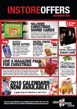This newsletter promotes several of our Christmas offers from a range of departments. It also connects with marketing distributed to thousands of homes around the centre in recent weeks. It respects core departments – magazines (suggesting a Christmas gift pack) and cards (the very successful Hallmark sound cards) – while promoting calendars (great margin and range point of difference), the new moon board game (competing with the big guys and winning!), Scotch gift wrap cutter (everyone needs one!) and our digital photo key rings (also competing with the big guys and winning!).