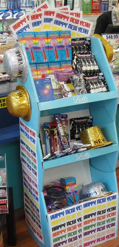 Our small display of New Year’s Eve products, placed in front of the counter, is working well. The various party goods, hats, 2010 glasses and glow sticks are selling from the re-purposed Letts Diaries display unit. We are expanding our range of party goods in 2010 so we want to take evry opportunity possible to promote party times – like NYE.