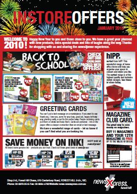 Our January customer newsletter – on display out the front of our newsagency – is promoting back to school, great ink deals, our card range and three sets of branded product deals.