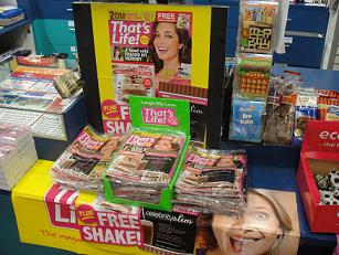 We have replaced Burke’s Backyard at the counter with That’s Life this morning. That’s Life wins this prime impulse purchase position with the free pack of Celebrity Slim being given away with this issue. We’ll leave this display in place until Friday depending on sales.