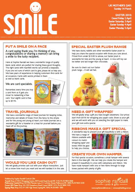 Click here to see a copy of the latest newsletter from our Sophie Randall gift shops. We have gone to a mid month publishing date as this fits better with our seasonal marketing plan. The newsletters are very popular with our customers, we have good evidence that they drive sales. This year, we also changed approach to connect with themes. Last issue it was Love for Valentine’s Day. This month, it’s Smile to connect with card giving occasions outside of major seasons.