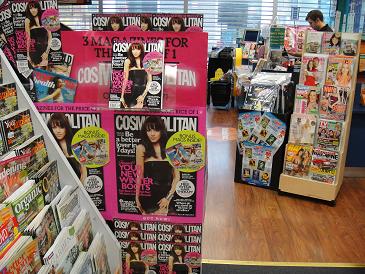 We are promoting Cosmopolitan magazine to shoppers as they leave our busiest magazine aisle. This location, on the back of an ACP magazines stand, has been a successful location for us. Toward the top of the display is an acrylic shelf off of which customers can purchase the title.