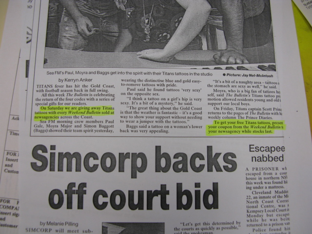 Newsagents on the Gold Coast may need to be ready for tears this weekend with another publisher offer. This time, Gold Coast Titans tattoos are available on presentation of a coupon in Weekend Bulletin. The article (click on the image for a larger copy) says that tattoos are available with every copy sold in newsagencies. The big question is whether newsagents will be given enough tattoos for every copy they receive. The other challenge is handling copies sold in newsagencies versus elsewhere.