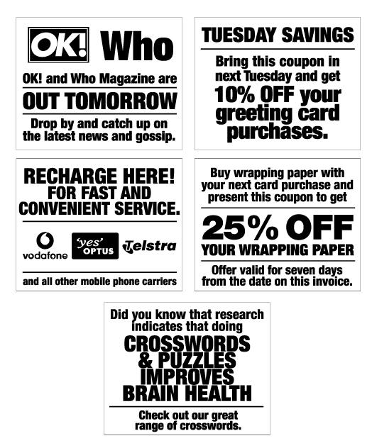 My post yesterday about promoting OK! and Who on newsagency receipts sparked emails and calls from suppliers and newsagents wanting to know more. It’s an easy process to included this free marketing collateral on receipts. It makes sense to get more value from the receipt than just as a record of a sale. Click on the image to the left to see a range of coupons we have prepared to trial in our newsagencies over the next few weeks. While we have done this promotion for years, the new coupons breathe new life into the opportunity.