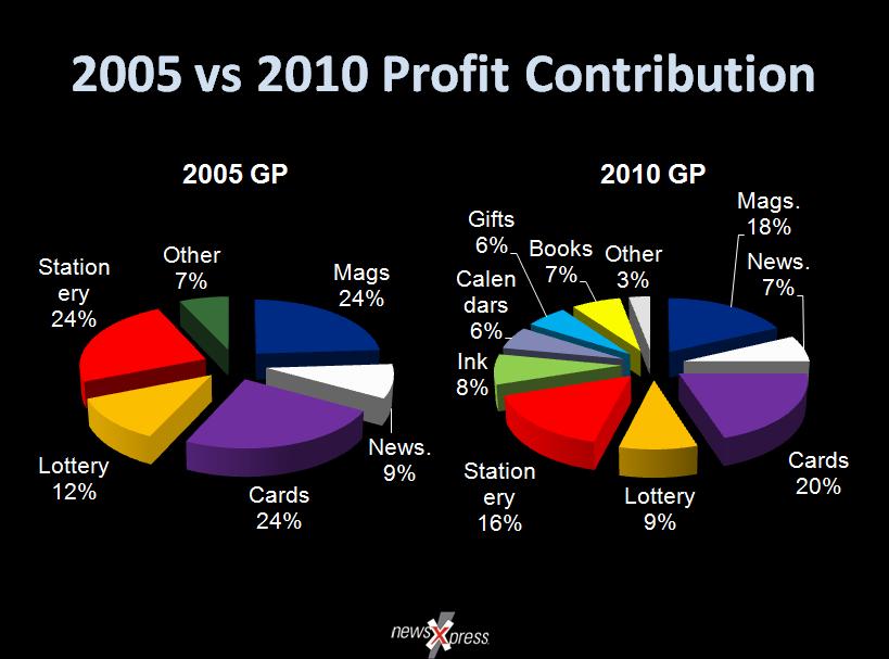 Speaking at the QNF State Conference yesterday, I presented a comparison of the GP contribution by product categories in 2010 compared to 2005 – from a cross section of newsagencies in the benchmark pool I work with.