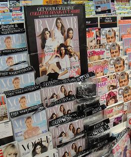 We are promoting Harpers Bazaar in its usual location deep in our main women’s magazine aisle with an A2 poster placed above a double column of stock. We chose to do this to promote the free Collette Dinnigan T-Shirt which comes with the magazine – the pack looks better opened out rather than folded as you will see in most retailers.