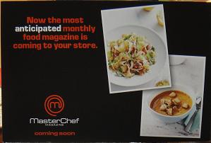 Kudos to News Magazines for the teaser postcard they sent to newsagents and other magazine retailers yesterday promoting the soon to launch MasterChef magazine. I can’t recall a publisher teasing the launch of a new title in this way. With magazine departments crowded and busy, the postcard is a good reminder of a major launch without intruding too much on our day to day business.