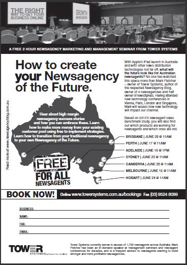While the workshop is funded by my software company, Tower Systems, it is NOT a sales pitch. I’m not out to sell you anything. What I want is a healthier and stronger newsagency channel, a channel with a bright future for newsagents, their employees, their suppliers and all of the families which rely on the newsagency channel for income.