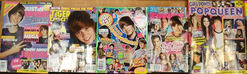 We have the magazines with Justin Bieber on the cover laid out in a row in our teen and music magazine area. Most are selling, a couple are not. The ACP Bieber fanzine has done well for us.