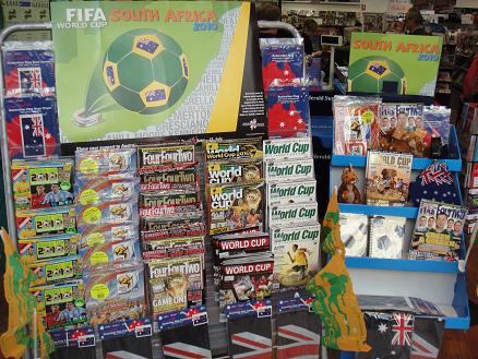 On Friday we kicked up our 2010 World Cup magazine, sticker and supporter products promotion with a fresh display at the front of our newsagency. While we were running low on most stock items, we were still able to bring something half decent together. By the end of yesterday, sales showed that the effort was well worth it. You only had to watch customers as they approached the store, the display was very popular. I saw it draw several people who were walking past the newsagency to exit the centre – it definitelty drove some new traffic for us.