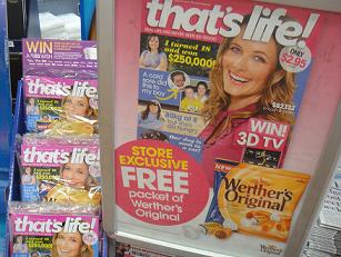 We are promoting the That’s Life at our newspaper stand this week thanks to the free pack of Werther’s Original candy with each magazine. Sales in the first day have been excellent, a noticeable lift. This is an example of a good gift with a magazine – see the next blog post about to go up. That’s Life rarely has cover mounts and when they do they are very popular.