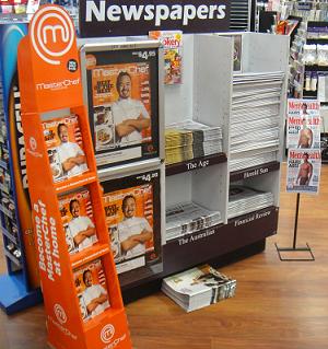 We have the latest issue of MasterChef magazine on display at our newspaper stand as well as with weeklies and in the food section. The tactical placement next to the newspaper stand works best for us, especially in the first two weeks.