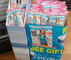 The free Avon eye cream bagged with the magazine makes the package challenging to display. We have opted for a dump bin approach – as shown in the photo. Look next to the dump bin and see how the magazine looks in the Pacific stand sent last month for their health titles.
