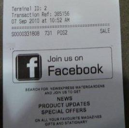 The team at newsXpress Watergardens, a store in which I have half share, is promoting the store’s Facebook page on all customer receipts. This clever passive marketing has been used successfully to drive repeat business from customers and is now part of the strategy for growing engagement in the store’s Facebook page. Using customer receipts in this way is low-cost, smart and easy.