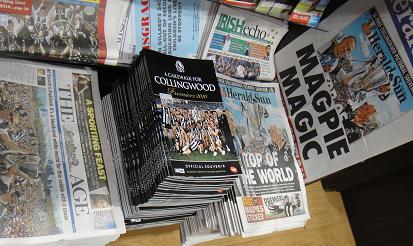 We have placed the AFL premiers souvenir, A Cakewalk for Collingwood, in the only logical place for it today, between the Herald Sun and The Age newspapers. Based on questions from customers yesterday about the Knight poster I’d expect the souvenir to sell very well over the next couple of days.