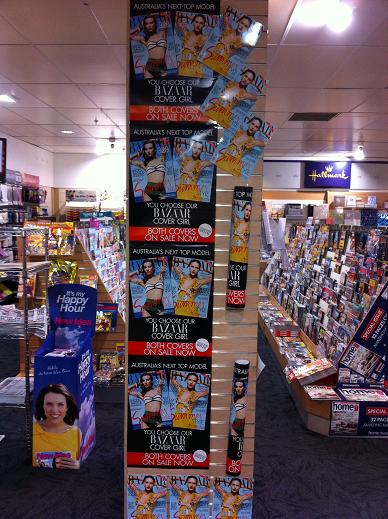 Our Frankston store has done a terrific display promoting the two covers of Harpers Bazaar. This issue cashes in on the confusion over the announcement of the winner of Australia’s Next Top Model. The column covered with the display (click on the image for a larger version) is covered on all four sides – each promoting a different magazine. The Bazaar display is what customers see as they enter the store and head to the magazine department. It is also next to our main newspaper stand.