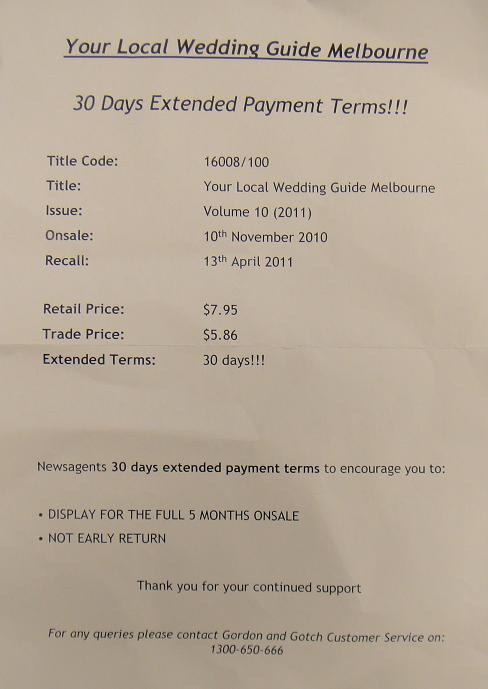 I feel for small publisher, I really do. It is tough to drive sales with a tiny or even non-existent marketing budget. They turn to the next option, trying to get newsagents to hold onto their products long enough to drive some sales. Your Local Wedding Guide Melbourne is a good example of a publication facing challenges. The issue out on Wednesday has a five month on sale! Yes, five months! The publisher is enticing us to keep the product on the shelves for the full five months with one month delayed billing. Check out the note Victorian newsagents received on Wednesday – click on the image to see a larger version. It says Extended terms: 30 days!!! It then tells us to display for the full five months!!! If this title is not paying its way, especially in expensive shopping centre newsagencies it must/will be early returned. To leave it on the shelves losing money would be bad for business. Why don’t publishers and magazine distributors understand that? Because it does not suit their bottom line is the answer.